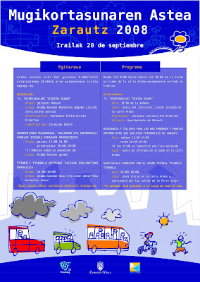Noiz? Irailak 20, larunbata. Adehriéndose a la iniciativa, a lo largo del día 20 de setiembre se desarrollarán diferentes actividades organizadas por el Ayuntamiento de Zarautz: fiesta de la bicicleta para los niños, hinchables, una exposición, un taller para los más pequeños, teatro callejero... ¿Dónde? En la calle Araba. ¿Cuándo? El sábado 20 de setiembre.